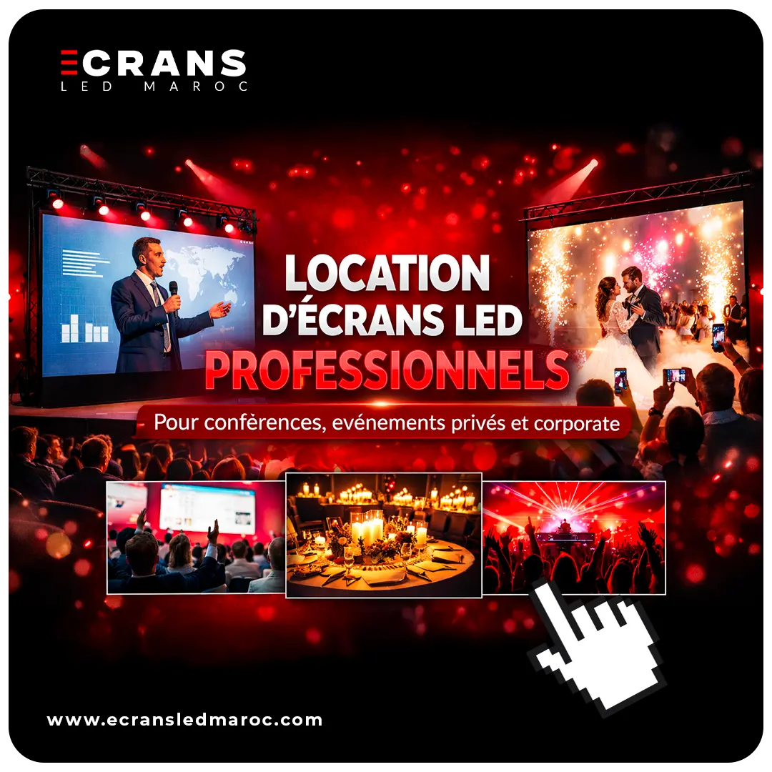 location écran LED Maroc, nous proposons la location d’écran LED et d’écran plat partout au Maroc pour vos salons, stands, événements et expositions. Que vous recherchiez une location d’écran LED à Casablanca, un écran géant pour un événement à Marrakech ou simplement une location d’écran au meilleur prix au Maroc, notre équipe vous accompagne avec des solutions professionnelles et rapides. Nos écrans plats et écrans LED haute définition sont idéals pour les stands d’exposition, les conférences, les foires et les événements corporate.